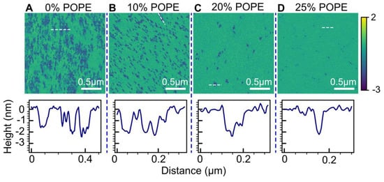 Influence of POPE content on bilayer modulations induced by 5 µM HttN. Lipid bilayer compositions: (A) POPC, (B) POPC with 10 mol% POPE, (C) POPC with 20 mol% POPE, (D) POPC with 25 mol% POPE. The lower panels display height profiles along the white dashed lines marked in the AFM images.