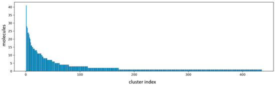 The result of clustering (similarity cutoff is 0.4). The horizontal axis represents the number of clusters obtained, while the vertical axis represents the number of molecules contained in each cluster.
