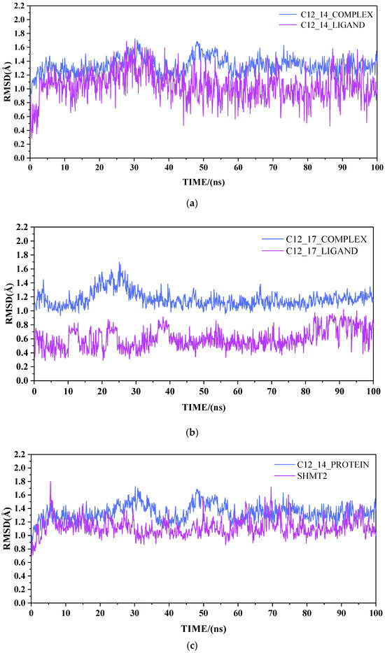 The compounds C12_14 and C12_17 possess the same molecular backbone but exhibit a significant difference in their comprehensive ranking. To assess the influence of simulation time on the simulation results, molecular dynamics simulations were performed, using a 100 ns MD simulation, on the complexes formed by these two compounds with SHMT2. Figure 3a,b show the RMSD values of the these two compounds over a 100 ns simulation. Specifically, Figure 3a represents the simulation trajectory of the C12_14–SHMT2 complex system, while Figure 3b represents the C12_17–SHMT2 complex system. As shown in the figure, the RMSD of both complex systems remains below 2 Å throughout the entire simulation process, and the fluctuation of these two systems are quite small in scale (less than 1 angstrom). We also plotted RMSD values of both ligand-bound and apo proteins in Figure 3c. Also, the RMSD of the ligand-bound protein is slightly larger than that of the apo-protein, but the difference is quite small and is largely believed to be the result of random fluctuations of individual trajectories. Thus, the conformational change in the protein upon ligand binding should be quite small.