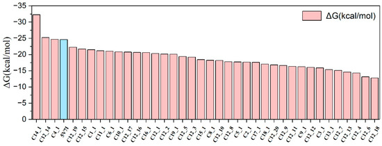 Furthermore, to further analyze the binding mechanism of the ligand–protein complex systems and the role of hot spot residues, we calculated the average energy contribution of all hot spot residues in the 38 systems, as shown in Figure 7.