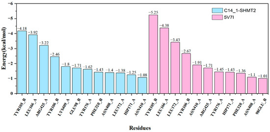 In addition, to verify the reliability of the calculation results, a comparison was made between the residue contributions of C14_1–SHMT2 and 5V7I, as shown in Figure 5. It illustrates that the residue TYR105, located on the B chain near the binding pocket, is the residue that contributes most to the binding of the ligand and receptor proteins. The residues LEU166 on the A chain and TYR106 on the B chain also significantly contribute to the binding energy.