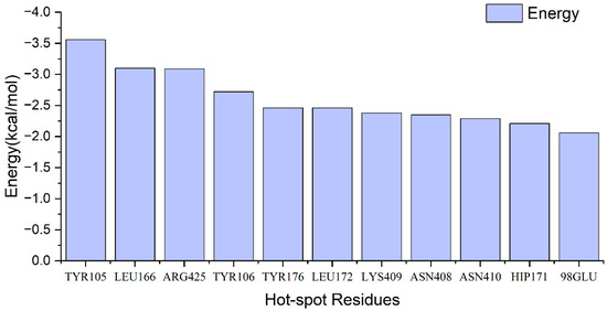 Figure 7 shows that the B-chain residue TYR105 and the A-chain residue LEU166 were consistently predicted to be hot spot residues in all 38 complex systems, with an average energy contribution of −3.56 kcal/mol and −3.10 kcal/mol, respectively. This suggests that these two residues have the most significant impact on binding affinity and are the most critical amino acids in the binding process. Additionally, the A-chain residue ARG425 and the B-chain residue TYR106 also play important roles in binding energy, with an average energy contribution of −3.09 kcal/mol and −2.72 kcal/mol. Moreover, there was a slightly less predictable, but still significant hot spot on the A-chain residue TYR176, with an average energy contribution of −2.46 kcal/mol. Additionally, residue 98GLU_B was identified as a hot spot only once and contributed a binding energy of −2.06 kcal/mol.