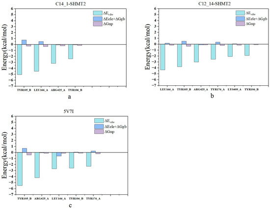 The total energy contribution of hot spot residues: (a) the hot spot residue of C14_1–SHMT2 are TYR105_B, LEU166_A, ARG425_A, and TYR106_B; (b) the hot spot residue of C12_14–SHMT2 include LEU166_A, TYR105_B, ARG425_A, TYR176_A, and LYS409_A; and (c) the hot spot residue of 5V7I are TYR105_B, LEU166_A, LEU172_A, and TYR106_B.