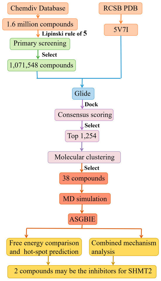In this study, a screening was performed on 1.6 million molecules from the ChemDiv database, resulting in the identification of 38 potential SHMT2 inhibitor molecules. To quantitatively predict the binding energy between the protein SHMT2 and its inhibitor molecules, the ASGBIE method was employed to analyze the protein–ligand interactions. A comparison was made with the binding mode of the protein–ligand molecule in the crystal structure 5V7I, revealing the involvement of the same key residues in the binding energy, consistent with the crystal structure.