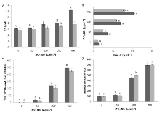 Relative (percentage of the control group) level of NO secreted by HUT-78 and HL-60 (A) cells after 48 h contact with ZrO2-NPs. Concentration of caspase-9 (B) in the HUT-78 and HL-60 cell culture medium after 48 h treatment with ZrO2-NPs. The TRO in systems containing HL-60 (dark bars) or HUT-78 (bright bars) cells (C). TRO was expressed as a percentage of reduction in DPPH level, in comparison to the control blank sample. There was a relative increase in the intracellular concentration of ROS in HL-60 (dark bars) or HUT-78 (bright bars) (D) cells after 48 h of treatment with ZrO2-NPs. The ROS level was calculated as mean ± SD with the untreated control set to 100%. Data points are means ± SD (five replicate trials). Different letters indicate significant (p < 0.05) differences between treatments.