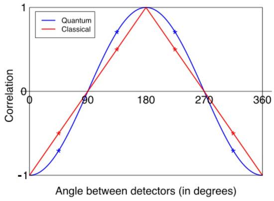 In a standard “Bell/EPR” experiment, e.g., as performed by Aspect et al. [1] and as replicated many times thereafter, e.g., [63,64,65,66,67,68,69,70], a source emits pairs of “particles” that can each occupy one of two states or that are or can be conceptualized as “spin” states and . The states are measured at locations A and B using detectors that each have an adjustable “setting” that is, or can be conceptualized as, a polarization angle. For classically correlated, but unentangled, spins, the expectation value for pairs of outcomes obtained at the two locations is proportional to the difference between the polarization angles. For pairs of spins in opposite directions, the usual situation for CHSH tests, the outcomes at A and B will be perfectly anticorrelated at 0° and 360° angular separation, perfectly correlated at 180° angular separation, and perfectly uncorrelated at 90° and 270° angular separation, as shown in Figure 1. Entangled photons, however, interfere with each other, replacing the linear dependence on angle with: