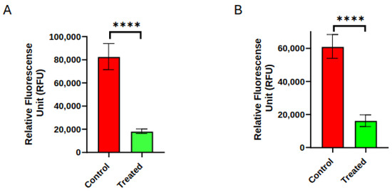 Biofield therapy (BT) markedly inhibited invasiveness of PANC-1 cells. Invasive potential of PANC-1 cells 48 h after 15 min BT treatment (Treated) or 15 min sham control (Control) for (A) experimental series one and (B) experimental series two. Data are presented as mean ± SD (**** p < 0.0001).