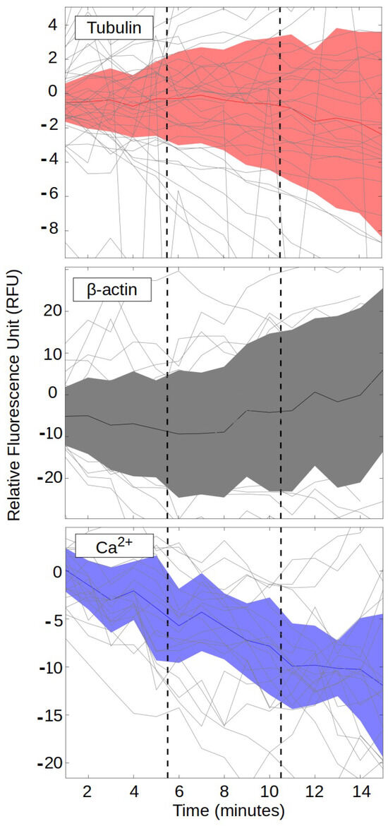 Real-time responses of tubulin (top), -actin (middle), and measures to 15 min BT treatments. Light-gray lines indicate differences between BT-treated PANC-1 cells and sham-treated PANC-1 controls for 40 (tubulin) or 20 (-actin and ) individual BT sessions. Orange (tubulin), gray (-actin), and blue () shaded areas indicate 95% confidence intervals around the minute-to-minute average values (orange, gray, and blue lines, respectively). Results for each assay were normalized to the average baseline value, obtained in the one minute prior to initiation of treatment, for that assay and treatment group. Vertical dashed lines indicate the 5 min central period when the BT therapist was allowed to move to relieve discomfort during the treatments.