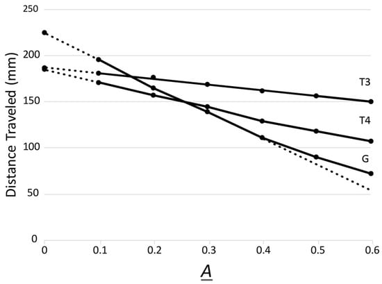 Multigel AGE analysis of phages T4 and clear-plaque phage G, with a phage T3 standard. AGE was performed for 16.0 h at 1.0 V/cm and 25 °C, as described in [39], with Seakem Gold agarose (Lonza, Rockland, ME, USA) running gels of the following six A values: 0.1, 0.2, 0.3, 0.4, 0.5, and 0.6. The electrophoresis buffer was 0.09 M Tris-acetate, pH 8.4, 0.001 M MgCl2. All three phages were analyzed in the same 18-track multigel. The preparation of phages has been previously described: T3 [35], T4 [33], and G [43]. Clear-plaque phage G has a genomic sequence that differs from both the reference GenBank sequence (JN638751) and its parent at three single nucleotide locations. These changes, at co-ordinates 330,356 (T > C), 343,537 (G > A), and 454,601 (G > A), would produce non-synonymous changes to the (functionally uncharacterized) gene products G_424 (p.V1452A), G_428 (p.G35S), and G_625 (p.G64S), respectively. The dotted lines indicate linear extrapolations.
