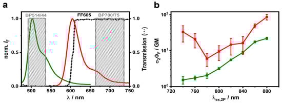 where ∫ Idv is the integral of the 2P emission spectrum, c is the dye concentration and is the fluorescence quantum yield [25]. The subscript S indicates the parameters of the reference dye fluorescein and rhodamine 6G, which were used as 2P excitation standards with determined to = 0.84 ± 0.04 and = 0.90 ± 0.05 (means ± SEM, N = 3), respectively [26], and known 2P absorption cross-sections [24,27]. The absorption measurements were performed with a Lambda 750 UV/VIS spectrometer (Perkin Elmer, Waltham, MA, USA). Fluorescence quantum yields were determined absolutely with the C 9929 integration sphere system (Hamamatsu, Hamamatsu City, Japan). For ∫ Idv determination, a mode-locked Ti:Sa laser system (Tsunami 3960; Spectra Physics, Mountain View, CA, USA) was used as an excitation source operating at a 82 MHz repetition rate with a pulse width of ~80 fs. Average laser power at 780 nm was adjusted to ~260 mW by a circular neutral density filter. The Ti:Sa laser was tuned from 720 nm to 900 nm in 20 nm steps. The excitation light was coupled into the fluorescence lifetime spectrometer FL 920 (Edinburgh Instruments, Edinburgh, UK) and was focused via a lens on the quartz cuvette. The fluorescence emission was detected with a photomultiplier (S300 blue-sensitive R1527, Hamamatsu, Hamamatsu City, Japan) in a spectral range of 400 nm–700 nm in 1 nm steps. Stability of the average laser power was controlled between the measurements with a power meter (Fieldmaster LM10 HTD with a detection range of 10 mW to 10 W).
