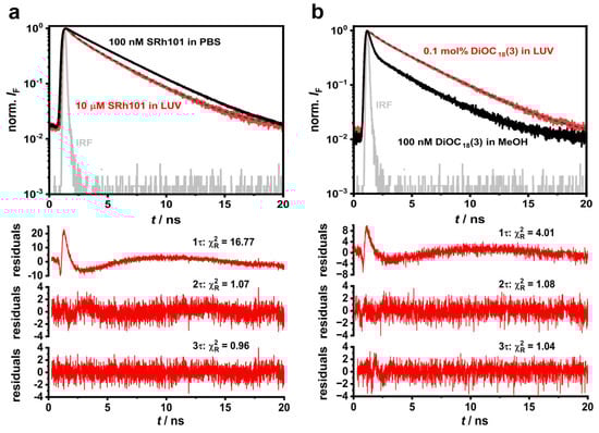 Comparative in vitro characterisation of the fluorescent dyes SRh101 and DiOC18(3) free in solution and in LUVs. Representative fluorescence decay curves of (a) SRh101 in PBS (black line) and SRh101-encapsulated LUVs (red line) as well as (b) DiOC18(3) in methanol (MeOH, black line) and DiOC18(3) incorporated into LUVs (red line), were recorded at λex,2P = 780 nm; the corresponding biexponential reconvolution fits (black dashed lines) of the SRh101-encapsulated LUVs and DiOC18(3) incorporated into LUVs are also shown. The weighted residuals of mono-, bi- and triexponential fits and their corresponding values are displayed below. IRF: instrument response function (grey line).