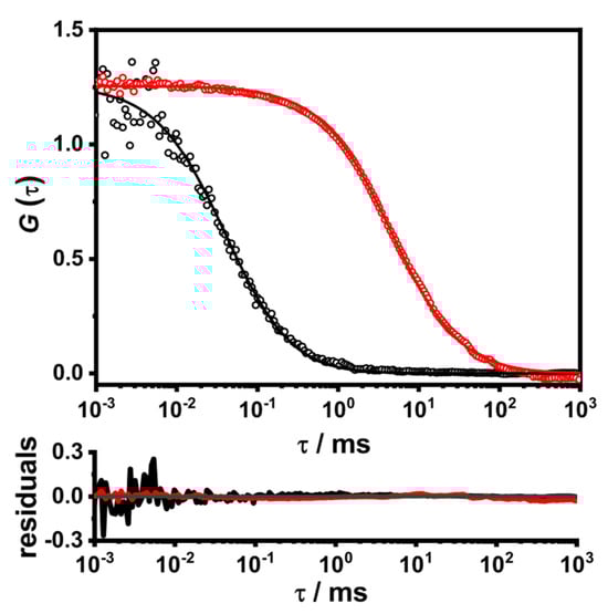 2P-FCS data analysis obtained by measuring SRh101 in phosphate-buffered saline (PBS) and in LUVs. Normalised fluorescence autocorrelation curves and the corresponding weighted residuals of free SRh101 (black circles) and SRh101-encapsulated LUVs (red circles) fitted by using a two-component diffusion model according to Equation (5) (solid lines) [29,30]. The curves were normalized by multiplying with the total number of fluorescent molecules in the detection volume, N, derived from the fits (G(0) = 1/N).