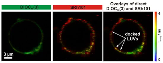 As SRh101-encapsulated LUVs were used as a drug carrier system, questions arose regarding the fate of this carrier during its interaction with GUVs, which served as artificial cells. Among others, one could imagine two simple scenarios, either an internalisation of the complete LUVs or a LUV-GUV–membrane fusion with the partial release of SRh101 into the GUV lumen. The results presented here were obtained with protein-free, SRh101-containing LUVs composed of DOPC:DOTAP (1:1, cationic) or DOPC:DOPE:DOTAP (1:1:2, cationic), respectively. The lipid compositions of the GUVs labelled with 0.1 mol% DiOC18(3) were DOPC:DOPS (3:1, anionic), DOPC:DOPE:DOPS (8:3:2, anionic) and DOPC:DOPE (3:1, neutral). We performed incubation experiments, in which GUVs were immobilised in an incubation chamber. Then, a suspension of cationic LUVs was added, and the subsequent diffusion behaviour of the LUVs was observed via 2P-FLIM recordings. Figure 4 shows false-colour-coded 2P-FLIM images of a neutral GUV (DOPC:DOPE, 3:1) from both detection channels, imaging the green and the red spectral regions, approx. 30 min after addition of cationic LUVs (DOPC:DOPE:DOTAP, 1:1:2). As expected from the fluorescence spectra (see Figure 1), only the fluorescence signal from DiOC18(3) embedded in the GUV membrane is observed in the green detection channel. In addition, the SRh101 fluorescence signal from the LUVs was not detectible in the green detection channel. Thus, bleed-through is minimal, which is important for analysing FCS signals. The fluorescence signal of SRh101 in the red detection channel was exclusively seen near the GUV membrane and exhibited a dot-like pattern. This observation supported the idea of an accumulation of the cationic LUVs at the neutral GUV membrane. Furthermore, the docking of LUVs to the GUV membrane appeared to be stable and randomly distributed.
