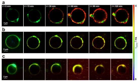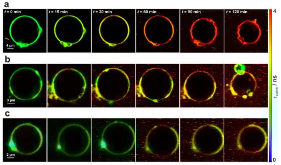 In order to evaluate the effect of the lipid composition on the LUV-GUV interactions, we started with incubation experiments and the analysis of 2P-FLIM images of a time series. Figure 5 shows the respective time sequences of a neutral GUV (a) and an anionic GUV (b,c) interacting with LUVs. Initially, at t = 0, the GUVs were homogenously fluorescent (=DiOC18(3) labelled membrane), tense and spherical. For the GUVs with the membrane composition of DOPC:DOPE (3:1) and DOPC:DOPE:DOPS (8:3:2), we observed changes in the fluorescence pattern approx. 15 min after the addition of LUVs with a lipid composition of DOPC:DOTAP (1:1). These changes manifested as red or yellow spots, corresponding to longer fluorescence decay times, as expected for SRh101, distributed along the vesicle’s rim in the confocal images. The appearance of these spots became more pronounced after 30 or 60 min (see Figure 5a,b). In particular, in the case of the neutral GUV (Figure 5a), the distribution of SRh101 fluorescence on the GUV surface appeared to be quite homogeneous. Similar reports on the docking of cationic LUVs immediately followed by hemifusion or fusion have been published previously [46,47]. As a consequence of the ongoing LUV accumulation, as well as the asymmetric transfer of LUV lipids in the outer GUV membrane layer, it is quite common that spontaneous curvature and the deformation of the GUV surface (here at 90 min) can occur [47,48]. Further, the process of docking and hemifusion can lead to vesicle rupture and collapse (here, at 120 min).