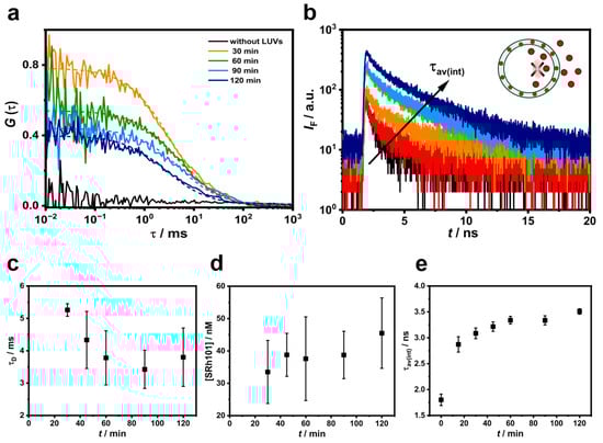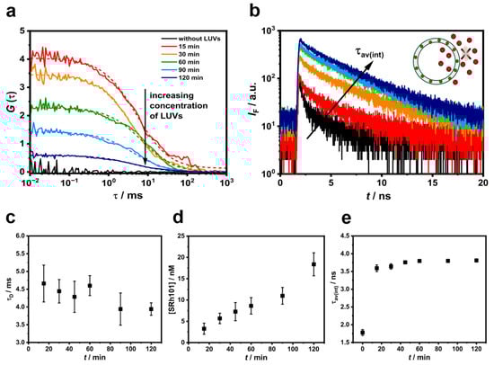 Fluorescence recordings of LUVs obtained inside the GUV lumen. Representative 2P-excited fluorescence autocorrelation curves (a) and 2P-excited fluorescence decay curves (b) obtained at distinct time points during the incubation of an immobilised anionic GUV (DOPC:DOPE:DOPS, 8:3:2) with cationic LUVs (DOPC:DOTAP, 1:1) for 120 min. The colour code for (a) and (b) is defined within the legend of (a). The measuring point in the GUV lumen and added LUVs are shown schematically in (b). Determined diffusion times (c), the concentrations of SRh101 in LUVs (d) and intensity-weighted average decay times (e) vs. the measurement time; means ± SEM of N = 6 (c,d) and N = 12 (e).