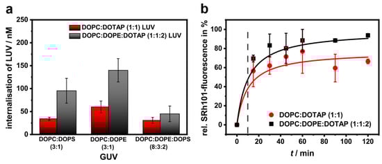 To assess the impact of LUV membrane composition on internalisation efficiency, we measured the time-dependent accumulation of SRh101 within individual GUVs (Figure 9b). Both LUV species, DOPC:DOTAP (1:1) and DOPC:DOPE:DOTAP (1:1:2), showed similar kinetic behaviour with a time to half saturation of 10 min. The SRh101 fluorescence intensity in the GUV lumen exhibited a rapid increase with incubation time, reaching equilibrium at approximately 60 min. Notably, LUVs with the lipid composition DOPC:DOPE:DOTAP (1:1:2) showed a slightly higher mean fluorescence intensity of SRh101 compared to DOPC:DOTAP (1:1) LUVs, regardless of the incubation time. Possible reasons for this observation could be the role of the “helper lipid” DOPE, which may promote the internalisation of liposomes, as well as the higher membrane charge density of the DOPC:DOPE:DOTAP (1:1:2) LUVs at a lower fraction of DOPC [51,57]. In general, our data show that SRh101 delivery and release from the cationic LUVs during complex interaction with the membrane lipids strongly depends on the lipid composition of a target membrane.