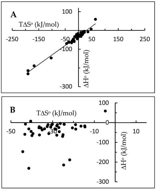 The linear relationship between ∆H° and T∆S° shown in part A of Figure 1 leads to an approximately constant value of ∆G° of about −30 kJ/mol. On the other hand, the ∆H° and T∆S° values included in the same figure are within the ranges of −232 kJ/mol to 59.2 kJ/mol and −190 kJ/mol to 64 kJ/mol, respectively. Relationships between ∆H° and T∆S° similar to the one shown here in Figure 1A have been repeatedly observed during the last decades [6,7,8,9,32,33,34], frequently displaying ∆G° values around −35 kJ/mol. Particularly interesting are the results obtained by Olsson et al. [9] from a survey of 171 protein–ligand interactions, rendering a similar approximate constant value of ∆G° and similar large ranges of ∆H° and T∆S° values. It is worth noting here the similarity between this range of ∆G° values found for protein–ligand interactions and the ranges of ∆G° values reported for the protein unfolding, which are typically between −20 and −60 kJ/mol [37,38].