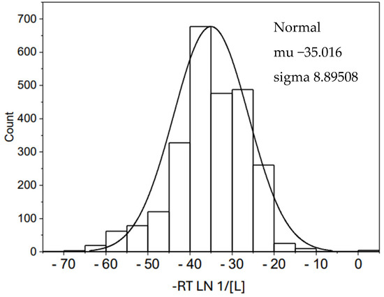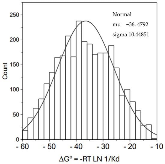 Normal distribution for affinities of protein–ligand interactions expressed as DG° (kJ/mol). The data were obtained from the 2020 version of the Protein Data Bank Database. The survey of data correspond to the period 2010–2020 and included 3025 values.