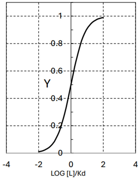 The fractional protein saturation, Y, as a function of LOG [L]/Kd. Following Equation (6), [L] stands for the ligand concentration and Kd (Kd = L0.5) stands for the dissociation constant of the protein–ligand complex.