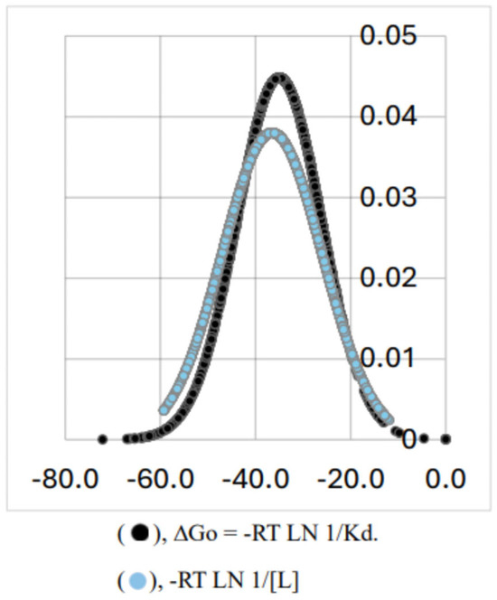 We have conducted a search of concentration of ligands, using the Metabolome Database [11] in order to obtain information about the in vivo concentration of ligands from different human sources. Figure 4 shows the normal distribution of 2558 ligands. The ligand concentration data have been transformed to chemical potential by the use of an analogous formula to Equation (6): −RT ln 1/[L], where L corresponds to the different concentration values found in the base. The result would be an energy value equivalent to the ∆G° of a hypothetical protein–ligand interaction in which L would be L0.5. As can be observed, the ligand concentrations transformed to chemical potential have a normal distribution with practically the same average value for the energy and standard deviation (−35.0 kJ/mol, SD 8.9) than the corresponding values for the normal distribution of protein affinities shown in Figure 2 (−36.5 kJ/mol, SD 10.4). Figure 5 shows the corresponding Gaussian curves for both data collection.