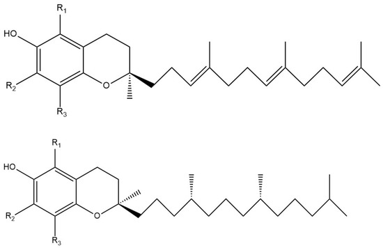 Chemical structures of vitamin E components. (Top) Tocotrienols: α-Tocotrienol: R1, R2, R3 = Me; β-Tocotrienol: R1 = Me, R2 = H, R3 = Me; γ-Tocotrienol: R1 = H, R2 = Me, R3 = Me; δ-Tocotrienol: R1 = H, R2 = H, R3 = Me. (Bottom) Tocopherols have the C12 long chain saturated: α-tocopherol, R1, R2, R3 = Me; β-tocopherol, R1 = Me, R2 = H, R3 = Me; γ-tocopherol, R1 = H, R2 = Me, R3 = Me; δ-tocopherol, R1 = H, R2 = H, R3 = Me.