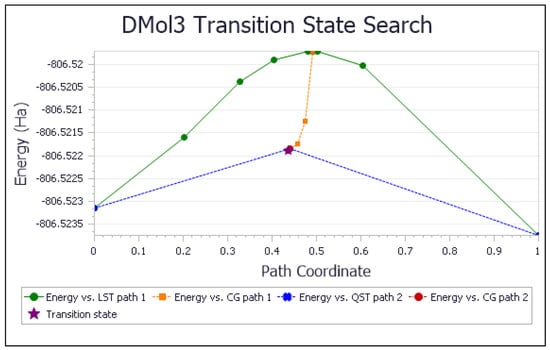 Due to the lipidic character of vitamin E with its long saturated hydrophobic side chain, α-tocopherol is recognized as the major antioxidant in membrane-rich fractions such as mitochondria and microsomes [54,55]. This strategic position makes vitamin E an important means of scavenging the superoxide radical inside the cell membrane [56]. It is, therefore, important to describe the initial interaction between the 6-hydroxyl in vitamin E-model and superoxide. Using computational methods, the reaction, with the minimized structures of reagent, transition state (TS), and product, shown in Figure 2, has ΔG of −0.4 Kcal/mol and an easily attainable E(barrier) of 0.8 Kcal/mol. Figure 3 shows details of the transition state search. These results demonstrate that vitamin E-model can intercept and neutralize superoxide. A potential ensuing step on the product shown in Figure 2 is described in Figure 4, where a proton is placed at van der Waals separation from the added superoxide, 2.60 Å. The minimization of Figure 4 arrangement (Figure 5) shows H2O2 formation and separated 1.654 Å from the O(polyphenol) in position 6, which is longer than the initial input conditions, 1.498 Å. Therefore, hydrogen peroxide was eliminated, and the residual semiquinone vitamin E-model was minimized. The next step in this study involves the π-π interaction with an additional molecule of superoxide. This process was shown to mimic superoxide dismutase action by some natural organic molecules and is described in previous studies and a recent review [57].