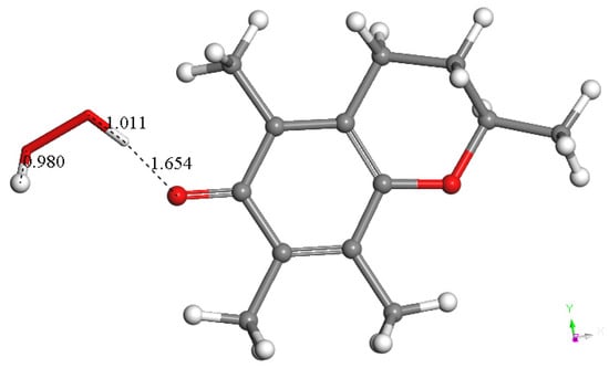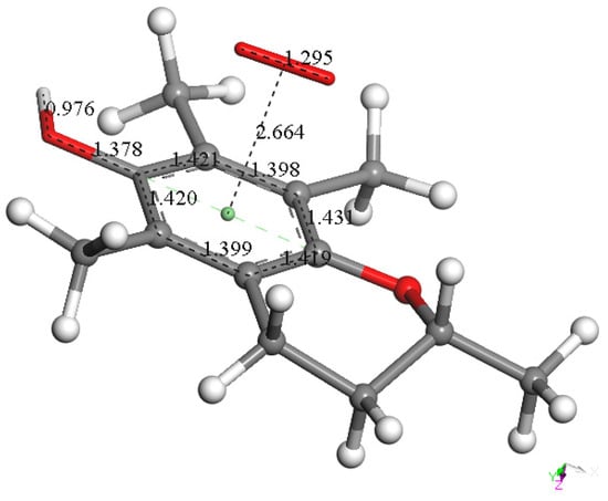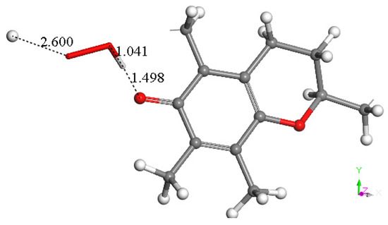 It can be expected that a cation will react with this arrangement, and so a proton was van der Waals placed near O6 of the anion arrangement, with an O6-proton distance of 2.60 Å. Its DFT optimization shows O6-H6 bond formation, 0.976 Å (Figure 7). This reaction has a small energy barrier, as observed after a TS search, and the resulting structure is shown in Figure S1. The C6-O6 bond length, 1.378 Å, is characteristic of a single bond (Figure 7) and is longer than the partial double bond in the initial species, 1.295 Å (Figure 6). The effects of proton addition to O6 are also evident in the aromatic ring, with four bond lengths becoming more similar, range 1.42–1.43 Å, than those in the reacting species, range 1.42–1.46 Å, while the remaining two bond lengths in the ring continue to be shorter and unaltered (1.398–1.399 Å). These effects are related to the shorter distance between superoxide and ring centroids, 2.664 Å, compared with the initial species, 2.899 Å. Thus, the approach of a positive charge, a proton, to the reacting species makes the π-π bound superoxide shift more electron density toward the ring. This forms a neutral and non-radical species, η-O2-vitamin E-model, and H2O2, resulting from the interaction of vitamin E-model with two superoxide molecules (one π and one σ added to the polyphenol), plus two protons, shown in Reaction (1).
