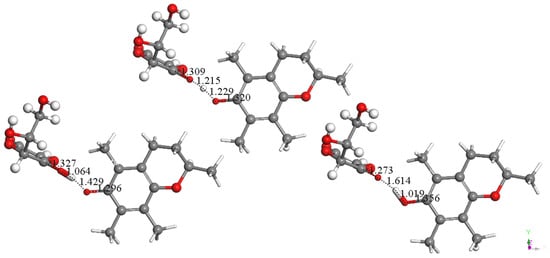 Therefore, the semiquinone vitamin E-model was minimized, and a superoxide radical was π-π placed above its aromatic ring (van der Waals distance, 3.50 Å). Upon geometry minimization, there is a shortening of the distance between both centroids, 2.899 Å, indicating bond formation. In the meantime, the initial superoxide bond distance of 1.373 Å shortens to 1.302 Å, which implies that some electron density becomes directed toward the ring (Figure 6). This overall arrangement is non-radical due to its even number of electrons, arising from two superoxides (each one contributing with an odd number of electrons), and it is negatively charged (−1), resulting from two negative charges of the two superoxides (from Figure 2 and Figure 6) and one proton (from Figure 4).