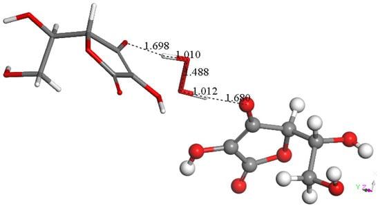 As shown in Figure 7, a reacting proton is needed to accomplish Scheme 1. Therefore, the interaction between the semiquinone vitamin E-model and vitamin C, with an initial separation of 2.60 Å (Figure 8), was studied with DFT, resulting in a proton transfer to the semiquinone (Figure 9). This reaction is possible as shown by ΔG = −2.7 Kcal/mol and E(barrier) = 0.7 Kcal/mol. Since the total charge of the system is zero, the result of this interaction is an ascorbate radical and vitamin E-model.