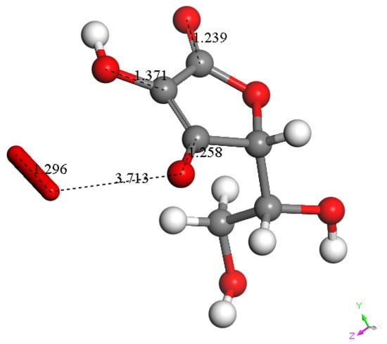 Interaction between superoxide and the vitamin C radical shown in Figure 12 (right). Superoxide gives its electron to the scavenger, which becomes a monoanionic quinone-like species. Meanwhile, the short O-O bond distance of the incoming radical, 1.296 Å, may be associated with a leaving O2 molecule, as shown by the separation between both units, 3.713 Å, longer than the van der Waals separation, 2.80 Å.