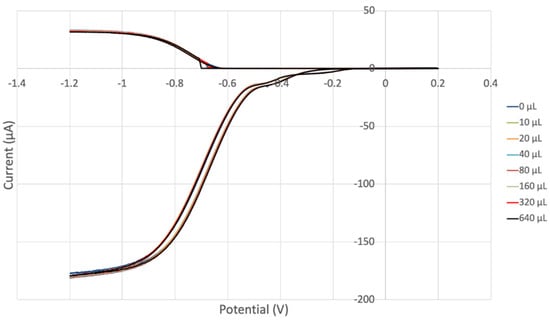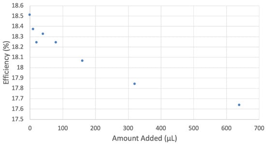 Collection efficiency of vitamin E cyclovoltammetry, y = −0.0012x + 18.352, R2 = 0.8969 considering all points; y = −0.0018x + 18.391, R2 = 0.8981, excluding the 640 µL data. In experiments at high concentrations of some antioxidants, for instance, quercetin [41], a related decreasing pattern in efficiency is seen, and the last data point is not included.