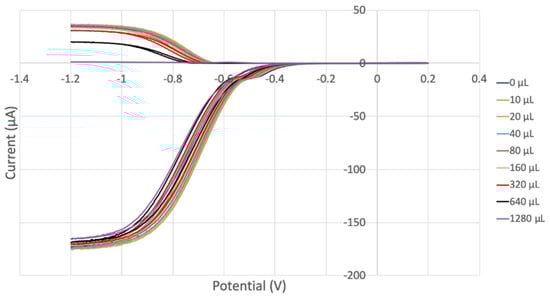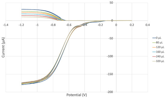 RRDE vitamin C results (Figure 16 and Figure S3), with slope −2.6 × 104, indicate a stronger scavenging activity than that of vitamin E alone. The voltammograms (Figure 16) are much more separated from each other than those shown in Figure 14 for vitamin E. The vitamin C slope of the efficiency graph, −2.6 × 104, is like eriodictyol (−2.2 × 104), weaker than butein (−11.2 × 104) and stronger than the commercial antioxidant BHT (−0.16 × 104) [57].
