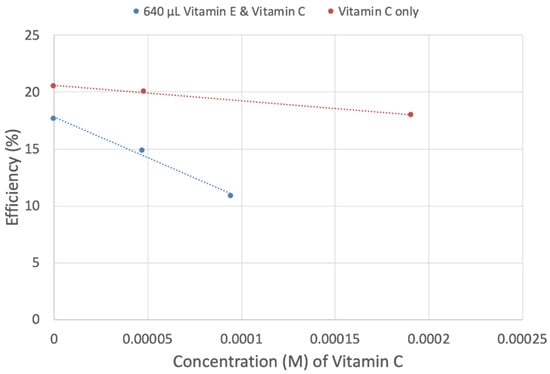 We were interested in analyzing a potential interaction between both vitamins regarding superoxide scavenging. Thus, to a fixed concentration of vitamin E, 640 μL, aliquots of vitamin C were added, and measurements were taken (Figure 17, Figure 18, Figures S3 and S4). Both vitamins are more effective together than individually. Therefore, combining vitamins E and C produces a steeper slope, −7.2 × 104 (Figure 18), than that of vitamin E alone, −1.8 × 103 (Figure 15), or vitamin C alone, −1.3 × 104 (Figure 18). This supports earlier studies describing a cooperative association between the two antioxidant vitamins [1,14,68].