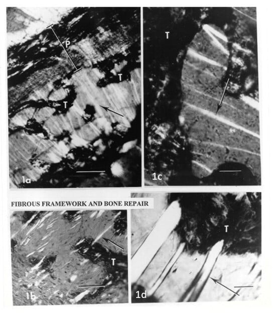 Figure 2). Stimulated by bone fragments (releasing unspecified factors), they bind new bone to old (without the mediation of cartilaginous callus tissue) and forge links with emergent endosteal fibres. This is demonstrated by the exclusively intramembranous trabecular regeneration after an iliac bone biopsy via Sharpey’s fibres radially polarised to the cylindrical walls of the extraction space [