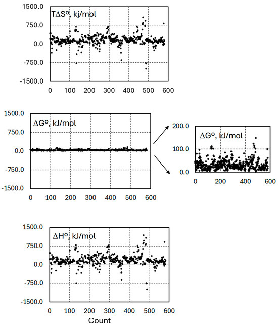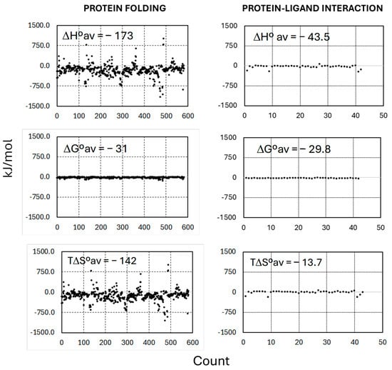 Scattering plots corresponding to the ΔH°, TΔS°, and ΔG° values for a set of 42 protein–ligand interactions reported in a previous publication by our lab [9,25,26,27,28,29,30,31,32,33,34,35,36,37,38,39,40,41,42]. All values shown in kJ/mo. The data for protein folding of Figure 1 have also been included for comparative purposes.