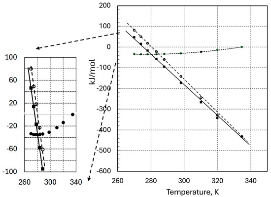 Figure 4 shows the results obtained for the average values of ΔG°, ΔH°, and TΔS°, as functions of temperature, corresponding to the 583 examples of protein folding included in the previous figures. As can be observed in Figure 4, the average values of ΔG° form a set of small and almost invariable negative values within the temperature range between approximately 0 °C and 40 °C. At the particular temperature of 25 °C, ΔG° = −30.9 kJ/mol, with a standard deviation of 21 kJ/mol. These values for ΔG° are extraordinarily small compared with the hundreds or even thousands of water–protein and protein–protein hydrogen bonds, van der Waals forces, Cation-P, salt bridges, and some other weak interactions, as well as hydrophobic effects and vibrational–rotational energy changes, involved in the folding of a protein. The energy value of each one of this type of weak interactions ranges from about 0.1–2 kJ/mol for van der Waals forces to about 2–10 kJ/mol for hydrogen bond interactions [17,18,19]. Changes in medium polarity, caused by folding and the nature of amino acid residues themselves, can affect the value of the enormous number of weak interactions, as well as the vibration frequencies and moments of inertia. This complex system, derived from the polymeric and quantum-mechanical nature of proteins, constitutes an extraordinarily sensitive system of folding regulation, always resulting in a value of ΔG° sufficient to maintain the functional structure of the protein in the range of environmental temperature, as well as vibrational frequencies and inertia.