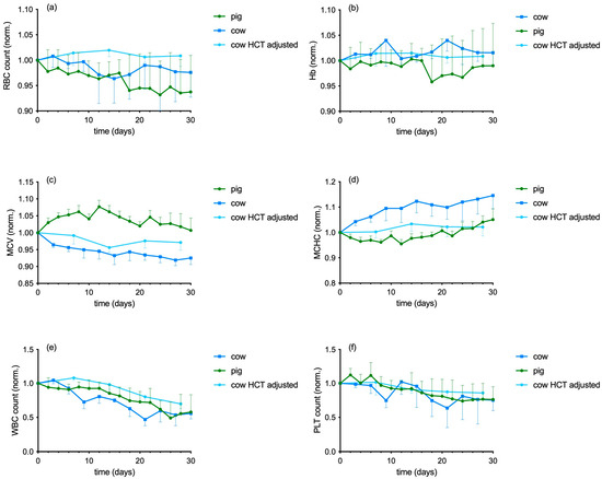 Change in the hemograms of porcine (n = 11) and bovine (n = 6) whole blood samples with storage time. (a,b): RBC count and Hb; (c,d): MCV and MCHC; (e,f) WBC and PLT count. Data present mean ± standard deviation of changes relative to baseline.