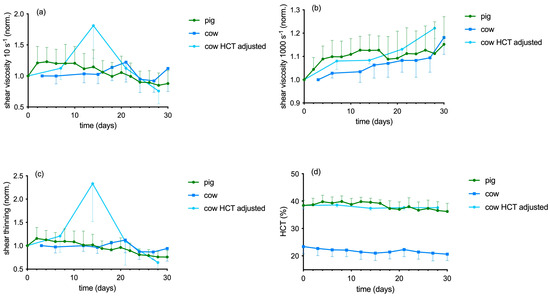 In both species, the high shear rate (1000 s−1) viscosity increased continuously (cow HCT-native p < 0.05; cow HCT-adjusted p < 0.01; pig p < 0.01; Figure 2b), although at the same time, the HCT decreased.