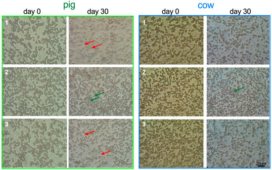 Blood smears of porcine and three selected bovine blood samples at the beginning and the end of storage. After 30 days of storage: pig 1: ghosts (red arrows) and cell debris; pig 2: crenated cells (green arrows); pig 3: ghosts. After 30 days of storage: cow 1 and 3: regular round shapes; cow 2: crenated cells. Scale bar: 20 μm.