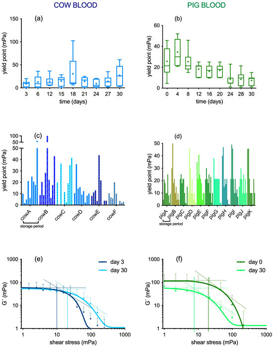 Yield points of bovine (n = 6, blue) and porcine (n = 11, green) whole blood obtained by amplitude sweep tests. (a,b): change in yield point with storage duration; the boxes represent median and interquartile range, asterisks show the mean value. (c,d): intraindividual variability of yield points during the time course; (e,f): yield point of fresh blood and aged blood on the 30th storage day: a quadratic regression curve interpolates the G′-values. The yield stress was obtained from the crossing point of the tangent that was drawn on the inflection point of this regression curve and crossed with a horizontal line through the first G′-values, which was extrapolated to the x-axis (method described in [12]).