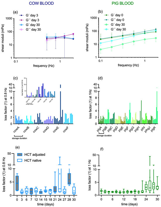(a,b): Frequency spectrum of G′ and G″ of cow (n = 6, blue) and pig (n = 11, green) whole blood at start and end of storage. Pig blood fluidified, as indicated by the decrease in G′, whereas the shear moduli of HCT-native bovine blood hardly altered. (c,d): The intraindividual variability of loss factor (G″/G′) during the time course. The inset in Figure 2c shows the HCT-adjusted bovine sample. (e,f): The change in loss factor with storage duration. In porcine samples, loss factor values increased beyond day 22 due to hemolysis. In HCT-native bovine samples, loss factor values showed large errors but did not change with storage time (except one outlier at +24 days, cow E). In HCT-adjusted bovine samples, the loss factor decreased transiently around day 14 and returned afterwards. Boxes represent median and interquartile range; asterisks show the mean value. Values below the torque limit of the rheometer (1 μNm) are deleted from the spectrum in Figure 5a.