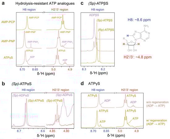 Reporter signals for nucleotide analogue hydrolysis with and without a regeneration system at 37 °C. All analogues can be identified in the 1H NMR spectra by signals corresponding to adenine H8 (approx. 8.6 ppm) and ribose H2′/3′ (approx. 4.8 ppm). Respective spectra are shown for (a) hydrolysis-resistant analogues, (b) (Sp)-ATPαS, and (c) (Sp)-ATPβS. The latter was produced by regeneration from ADPβS; the spectrum of the intermediate stage is shown as well. Peak assignments are derived from reported product preference of PK [38]. The reaction stalled after converting approx. 50% (4 mM) of ADPβS but resumed upon a four-fold dilution. Due to the pronounced water signal, no spectrum of H2′/3′ is shown herein. (d) Differences in nucleotide composition for ATPγS in presence or absence of the regeneration system: Without regeneration, ADP build-up is observed, while with regeneration, both ATPγS and ATP are present.