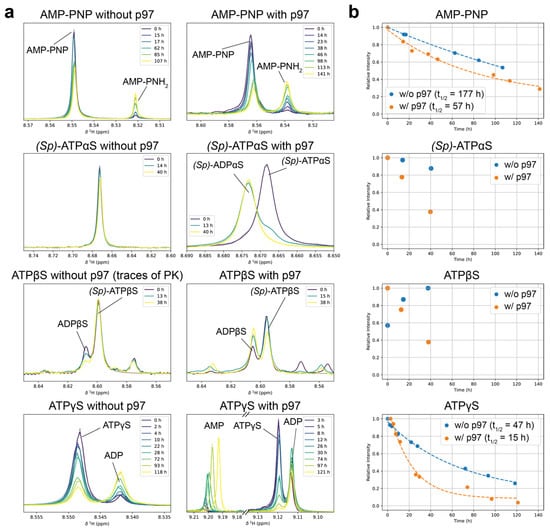 The stability of the ATP analogues AMP-PNP and ATPγS (each 1 mM) was assessed by monitoring the intensities of their respective peaks over several days at 37 °C. In both cases, the decay of peak intensities followed an exponential trend, enabling the determination of half-life values. For AMP-PNP, the half-life decreased significantly from 7.4 days in the absence of p97-ND1L to 2.4 days in its presence at 100 µM, indicating partial catalysed hydrolysis. Similarly, ATPγS exhibited a marked reduction in half-life from 2.0 days without p97-ND1L to just 0.6 days with the protein, demonstrating a much greater susceptibility to hydrolysis (Figure 4). These findings highlight that AMP-PNP is considerably more stable than ATPγS under the tested conditions. However, it is important to note that ATPγS exhibits a higher binding affinity for p97-ND1L compared to ADP and ATP (36.7 nM vs. 132 nM and 131 nM) [39]. This property allows for the characterisation of ATPγS-bound states of p97-ND1L, even when a substantial portion of ATPγS has undergone hydrolysis. In summary, ATPγS, AMP-PNP and AMP-PCP all show the stability necessary to run experiments over the course of at least two days at physiological temperatures.