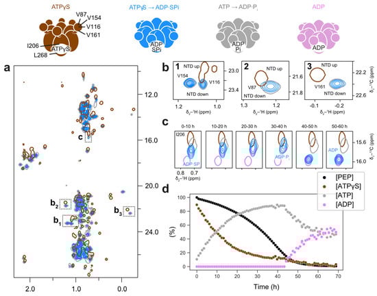 NMR spectroscopy provides atomic-level insight into the chemical environment of NMR-active nuclei in a sample through its most fundamental observable, the chemical shift. This capability makes it a powerful tool for simultaneously identifying bound nucleotides, monitoring small-molecule composition, and assessing structural states of enzymes. These strengths were leveraged to detect subtle structural transitions along the trajectory of enzymatic ATP hydrolysis, capturing static snapshots of multiple conformational states [11]. Importantly, NMR experiments can also be conducted in a time-resolved manner to trace in situ the progression of enzymatic reactions and to detect associated protein conformational changes. For example, by employing ATP in conjunction with a regeneration system fuelled by phosphoenolpyruvate (PEP), the activity of ATPase enzymes can be observed over extended periods of time. This system uses pyruvate kinase (PK) to continuously reform ATP from PEP and ADP [13,14]. The experiment’s duration is constrained by PK activity and PEP availability, as highly active ATPases can deplete PEP rapidly or outpace the regeneration process.