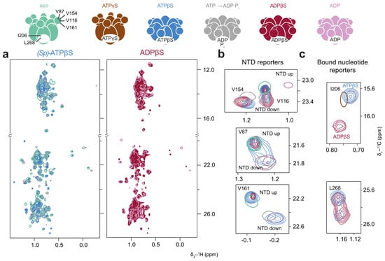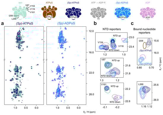 p97-ND1L adopts a non-native conformation in the presence of (Sp)-ATPαS. Methyl spectra of p97-ND1L-E305Q in the presence of (Sp)-ATPαS and a regeneration system, and (Sp)-ADPαS at 50 °C. The colour scheme of contour lines is indicated by the schematic representations of p97 above. (a) (Sp)-ATPαS (navy) induces a non-uniform conformation (apo and ADP·Pi shown in cyan and grey for reference, respectively), while (Sp)-ADPαS (light blue) leads to an ADP-like state (reference shown in pink). (b) Enlargements of NTD peaks V116, V154, V87, and V161 indicate a mixture of NTD up- and down-conformational states for both nucleotides, while (c) methyl groups reporting on the bound nucleotide yield ambiguous results, with I206 indicating an ATPγS or ADP·Pi-like state and L268 showing an ADP-like state. (Sp)-ADPαS shows mostly an ADP-like state.