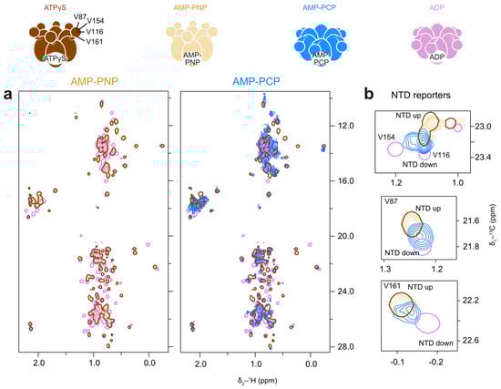 AMP-PNP stabilises the pre-hydrolysis state of p97-ND1L; AMP-PCP induces a mix of conformations in fast exchange. (a) Methyl spectra at 50 °C of p97-ND1L bound to AMP-PNP but not to AMP-PCP highly resemble those measured in the presence of ATPγS. (b) Enlargement of NTD residues V87, V116, V154, and V161. In the AMP-PCP-bound state (blue contours), peak positions are averaged between the up and down positions, indicating fast exchange between the two states.