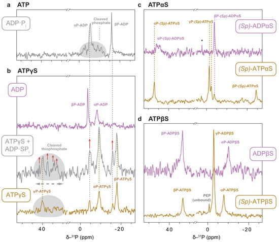 For (Sp)-ATPβS, we observed no significant PEP consumption during the experiment. The αP and γP phosphate resonances were nearly identical to those of native ATP, while the βP thiophosphate displayed signals extending from 30 to 39 ppm (Figure 9c). We attribute this complexity not to a mixture of nucleotides, but to the formation of multiple Mg2+ complexes, likely in intermediate exchange regimes that broaden the βP signals. In contrast, chemical shift differences between the nucleotides present—(Sp)-ATPβS, (Rp)-ATPβS, and ADPβS—do not explain this distribution, as their literature values differ by a mere 0.2–0.4 ppm [50]. In comparison, the spectra of ADPβS displayed a less broad distribution of βSP signals, suggesting no or a more uniform Mg2+ complexation.
