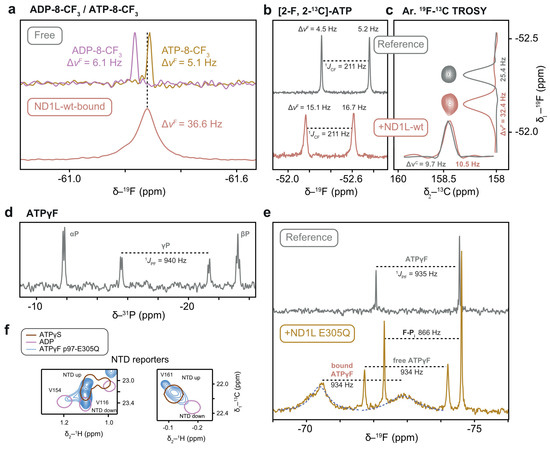 Given the challenges of directly observing p97-ND1L-bound nucleotides in solution NMR, we investigated the potential of 19F NMR as an alternative to 31P, in the hope of circumventing the technical effort of the MAS ssNMR setup. 19F is a highly NMR-sensitive nucleus with 100% natural abundance. Its high sensitivity to changes in the chemical environment finds many applications in drug screening and structural studies [54]. Especially, trifluoromethyl groups enhance sensitivity due to the presence of three equivalent 19F nuclei. Their utility as probes of molecular dynamics stems from sensitivity to both rotational motion about the internal symmetry axis and movements of the moiety to which they are attached [55,56]. Therefore, 8-trifluoromethyl-ATP (ATP-8-CF3) was developed as a nucleotide analogue [57].