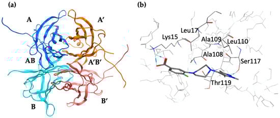 (a) Transthyretin (TTR) structure. Monomer chains are designated A, A’, B, B’. The two halogen binding pockets are designated AB and A’B’; (b) TTR-stabilizing ligand in pocket AB. Only residues comprising the pocket on monomer A are labeled for clarity.
