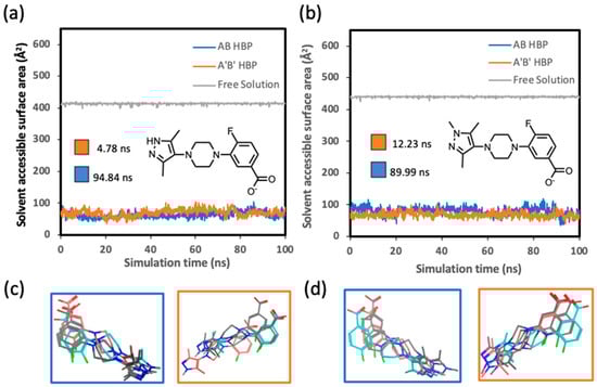 Solvent accessible surface area plots versus simulation time for (a) TKS14, (b) D8. Superpositions of ligands at timesteps with a low RMSD with respect to the average structure for (c) TKS14, (d) D8.